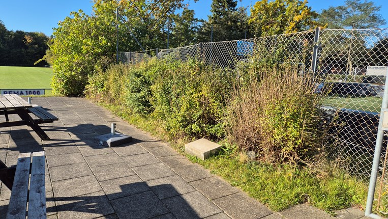 Den 4. december er det støbte hærdet og der er fyldt sandsæk støttemuren. Man begynder så småt at fornemme, at terrassen er blevet større. Gamle buske og nedslidt hegn mellem bandebanen og terrassen er fjernet.