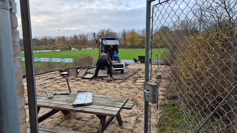Den 10. november gik arbejdet i gang. Kristoffer og Lars fjernede de gamle fliser, så maskinerne fra Ferslev/Skørping Entreprenør kunne komme til.