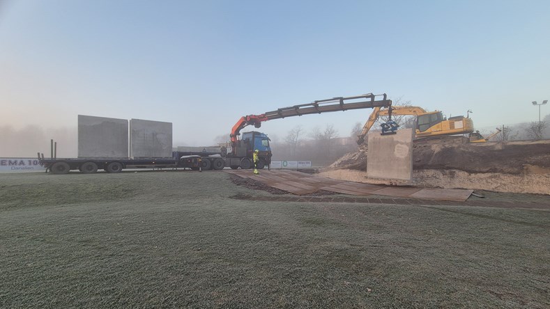 Den 26. november ankommer og placeres de 7 L-elementer, der skal danne støttemur for terrassen.